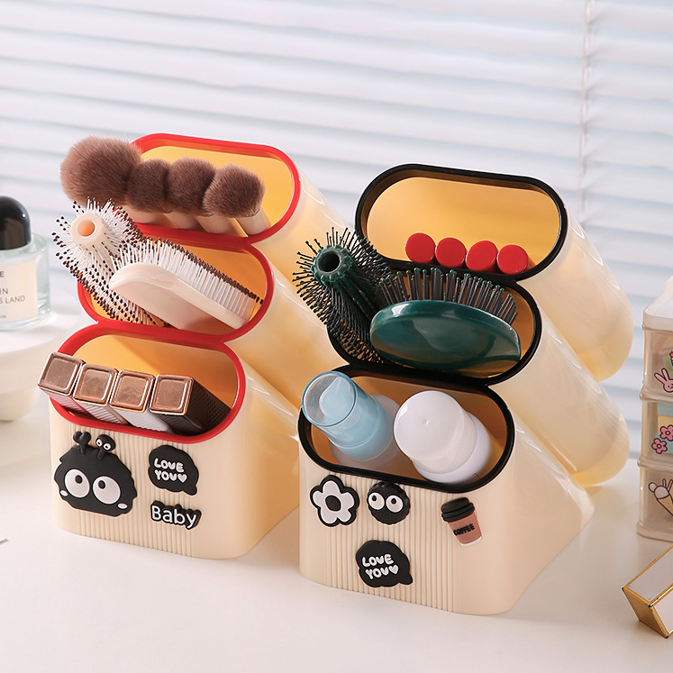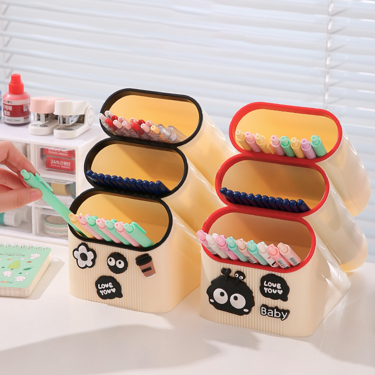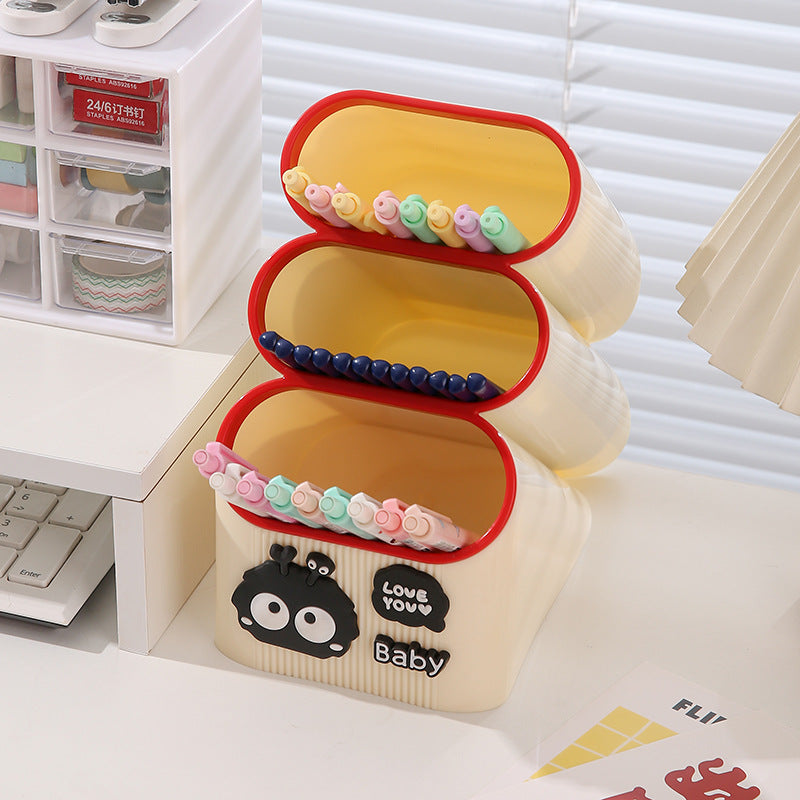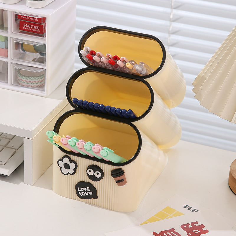 Mantén tu espacio ordenado y cute con nuestro organizador multiusos de 3 niveles. Su diseño inclinado permite ver y tomar todo fácilmente, y es perfecto para usar con plumones, lapiceros, maquillaje, skincare, brochas, accesorios, washi… ¡lo que necesites! Además, viene con stickers decorativos que le dan un toque adorable a tu escritorio o tocador.